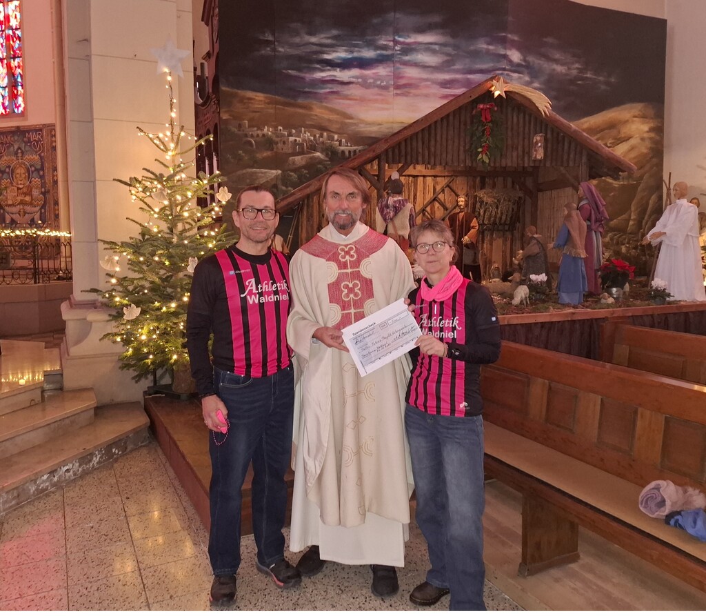 „Das Projekt von Pater Tobias ist beeindruckend und wichtig. Wir wollten unseren Lauf mit einem guten Zweck verbinden und freuen uns, dass der Kontakt zu Stande gekommen ist“, sagt Andreas Czermin (der Andi mit i), sportlicher Berater von Athletik Waldniel. Am 26. Dezember 2025 fand schließlich die feierliche Übergabe der Spende in der Herz-Jesu-Kirche zusammen mit Andis frisch angetrauter Frau Corinna in Duisburg statt.